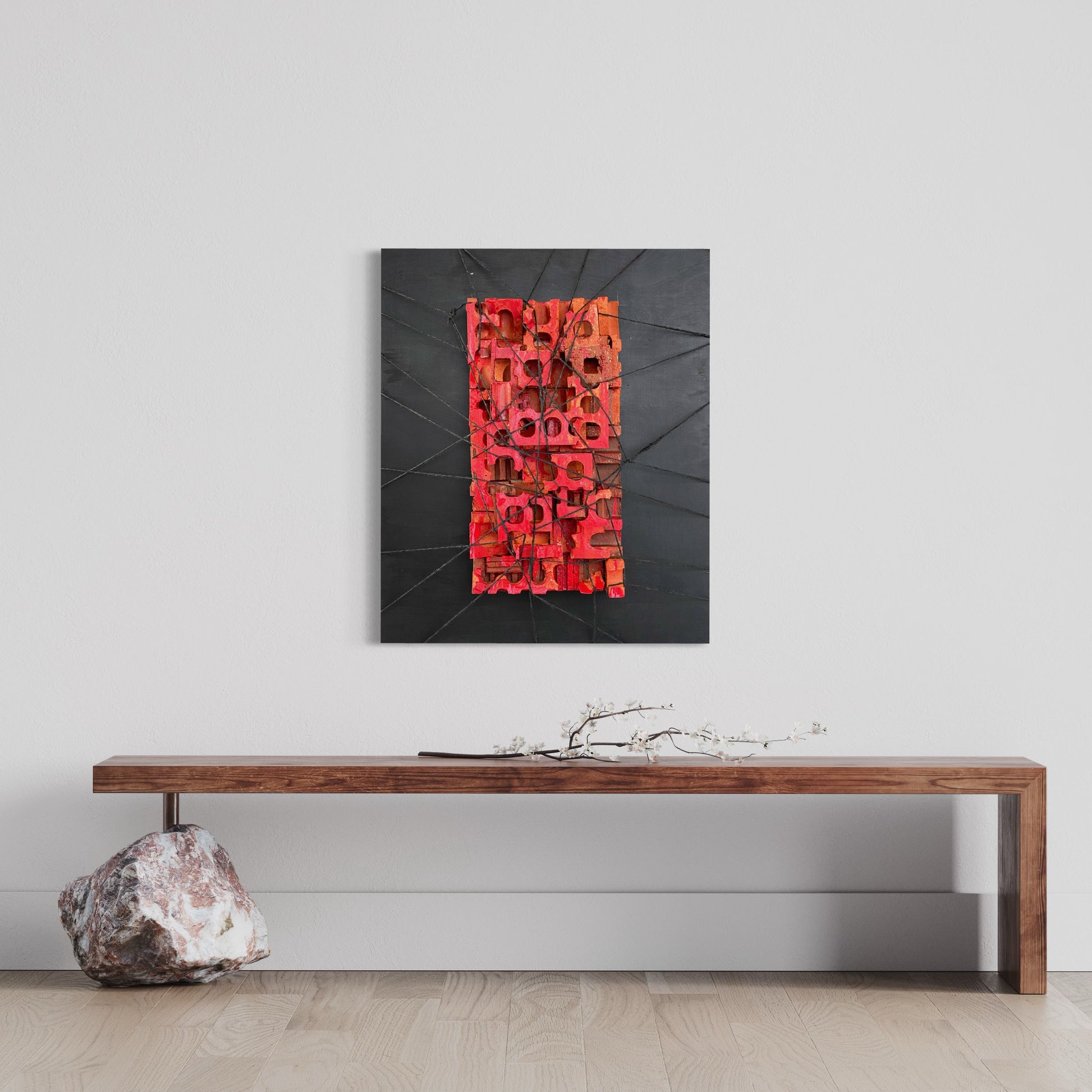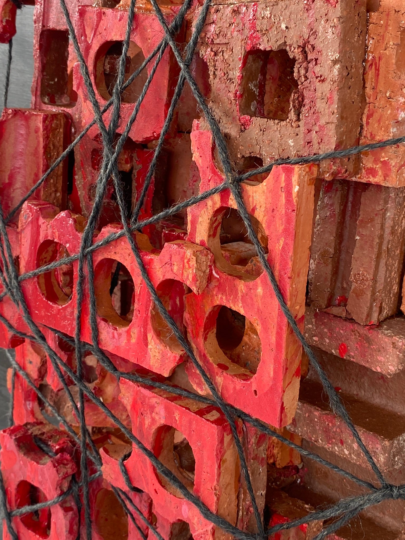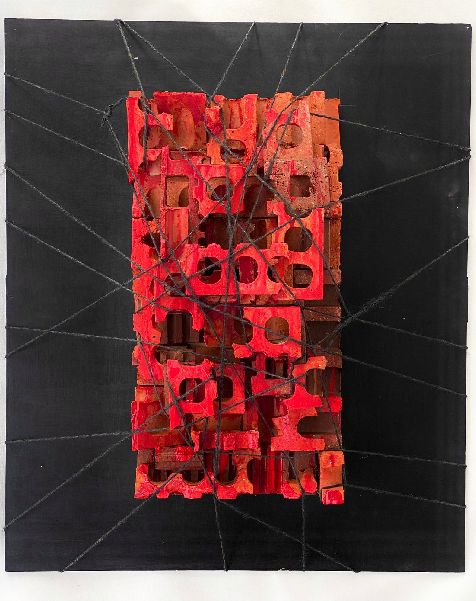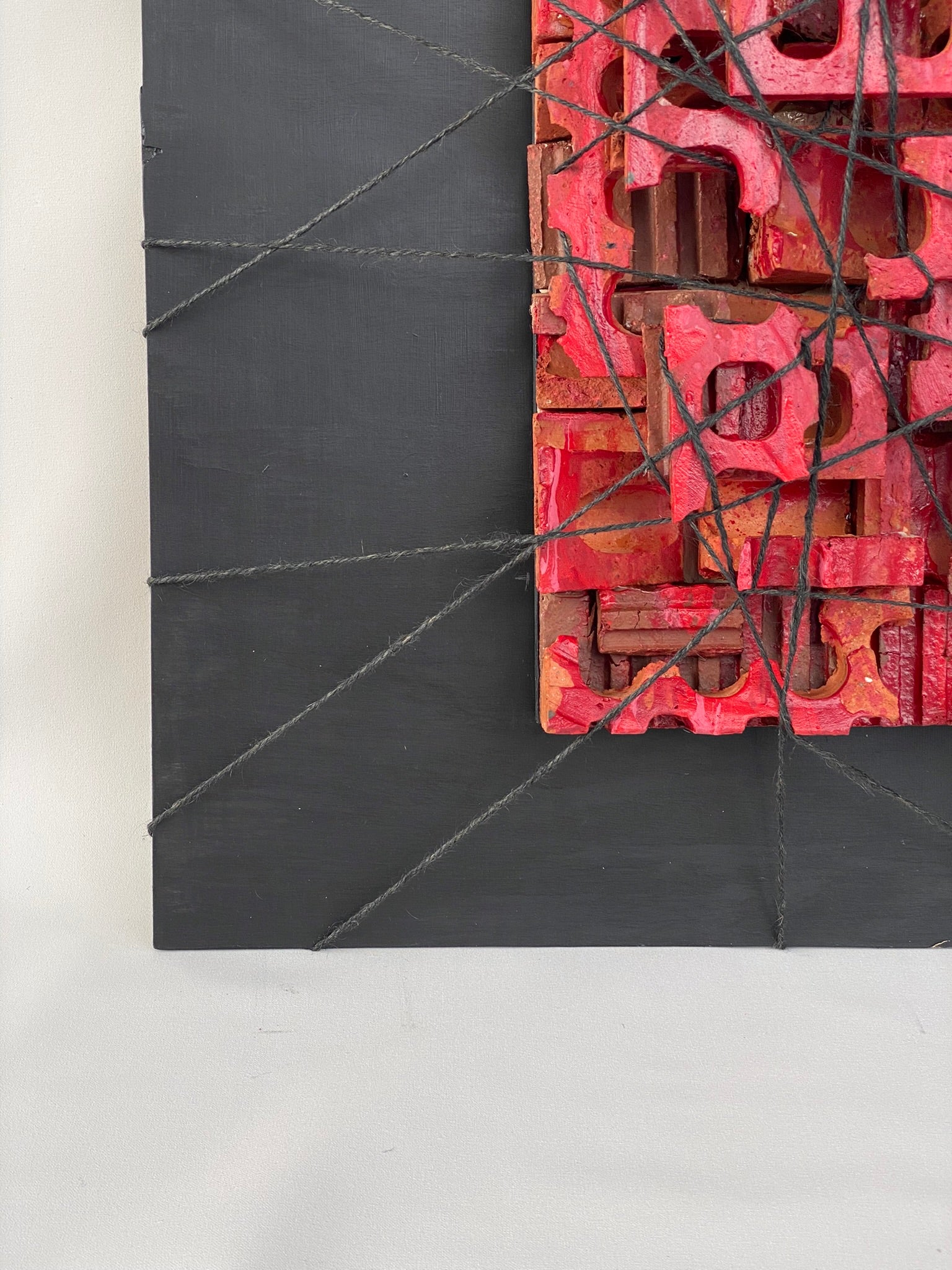 This sculptural work is a poignant commentary on the fragility of social unity and the devastating impact of the war conflicts. The fragmented bricks, painted in blood-like tones, serve as visceral symbols of demolished homes —once-solid foundations of the community and families now broken and torn apart. The rawness of the broken bricks and the sharp contrast of their rugged texture against the sleek black backdrop evoke a sense of loss and violence.