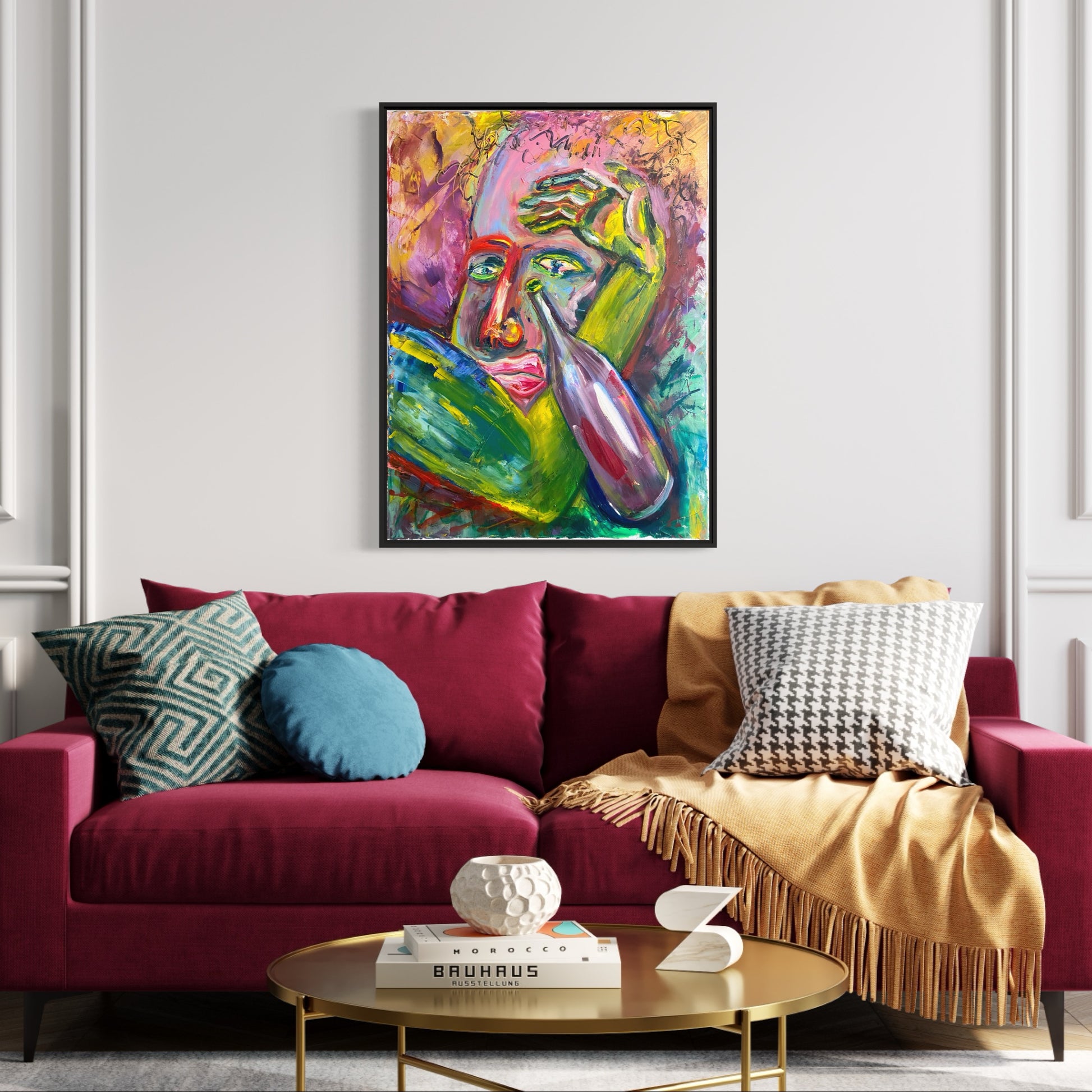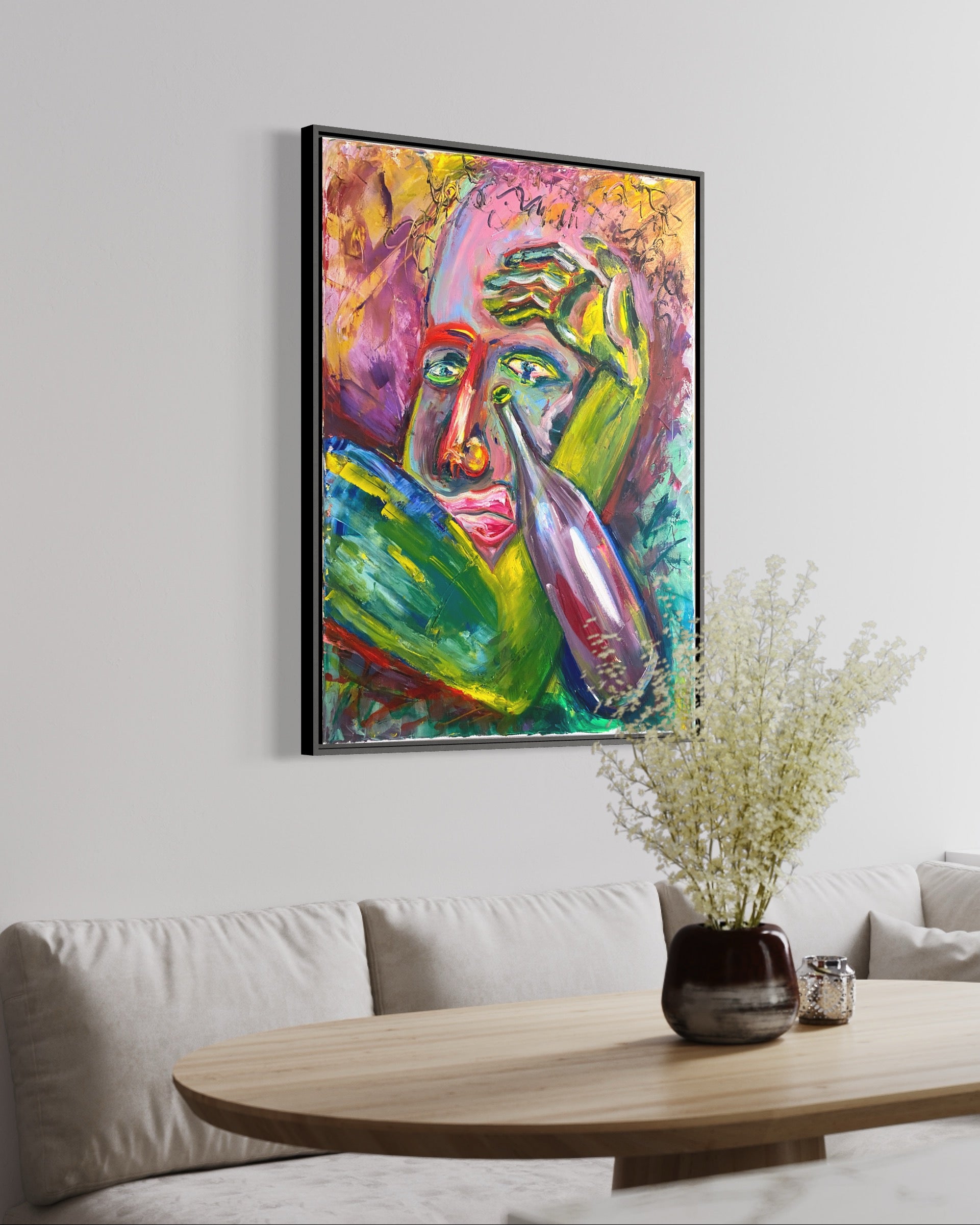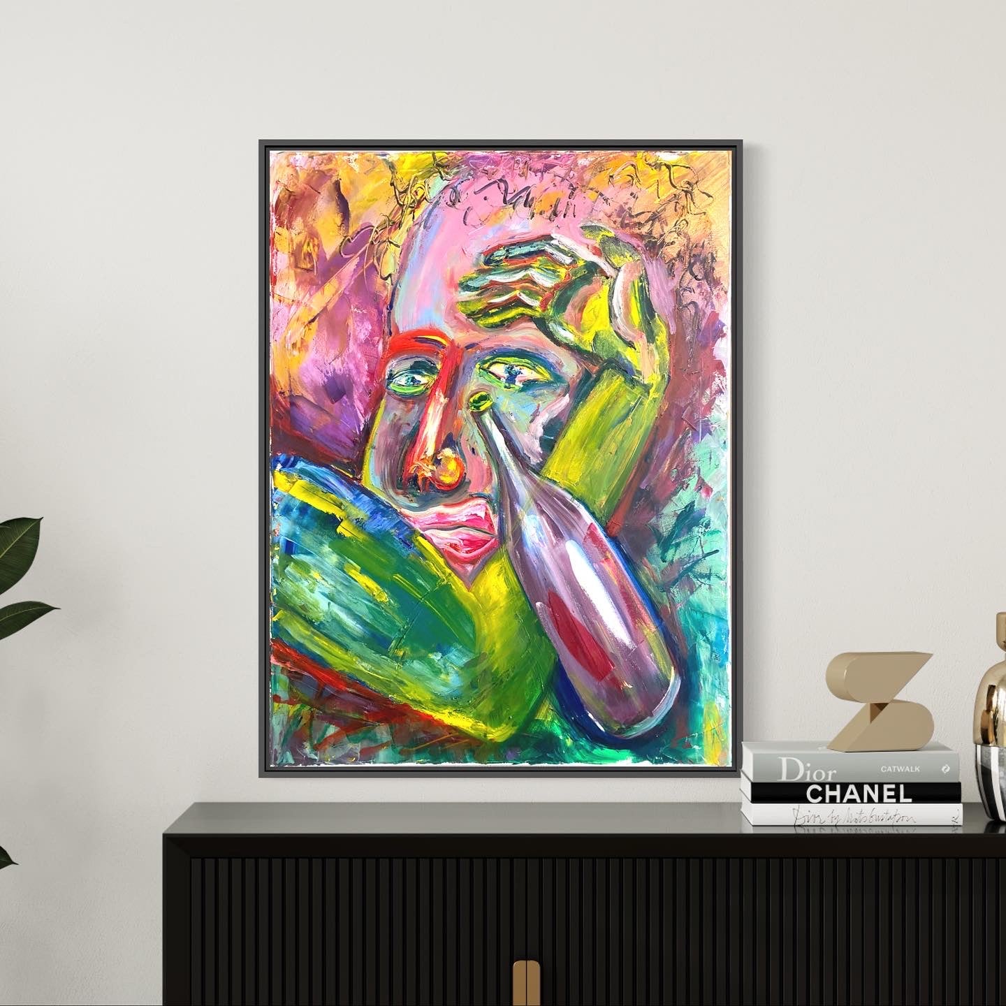“Discontentment” is a vivid and evocative exploration of the emotional undercurrent of alcohol-fueled gatherings, capturing the elusive and somber aftertaste they leave behind. The dynamic strokes and layered palette evoke a sense of restlessness, with the central figure embodying both engagement and detachment. The bottle—a symbolic focal point—presses into the figure’s face, representing the oppressive, yet alluring, presence of indulgence.