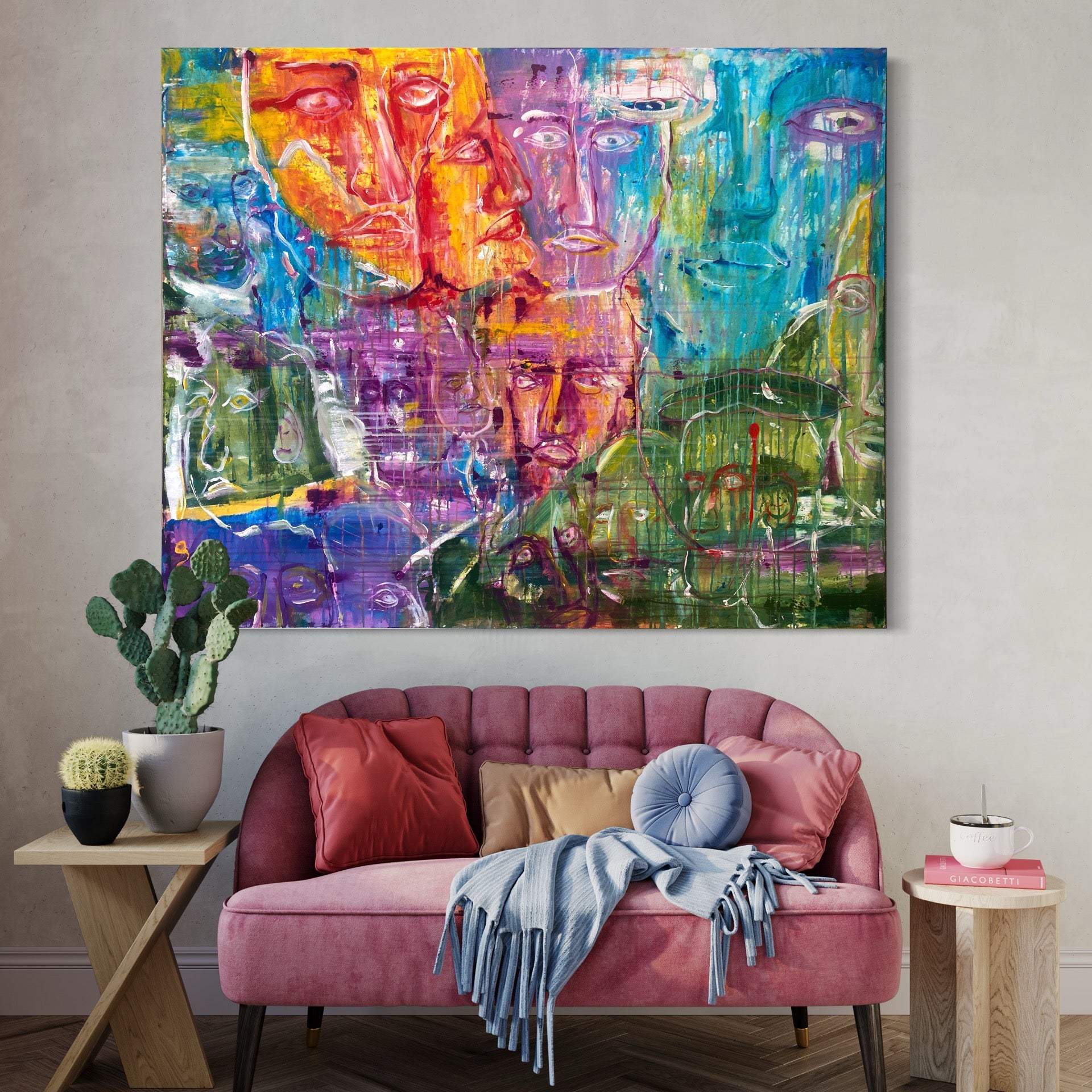 This evocative painting delves into the profound themes of transformation, and the shared human condition, presenting a striking visual narrative of metamorphosis within the chaos of conflict and war. The composition, a vivid melting pot of imagery, merges the haunting faces of individuals with fragmented elements of anonymous faces, blurring the lines between individuality and collective experience.