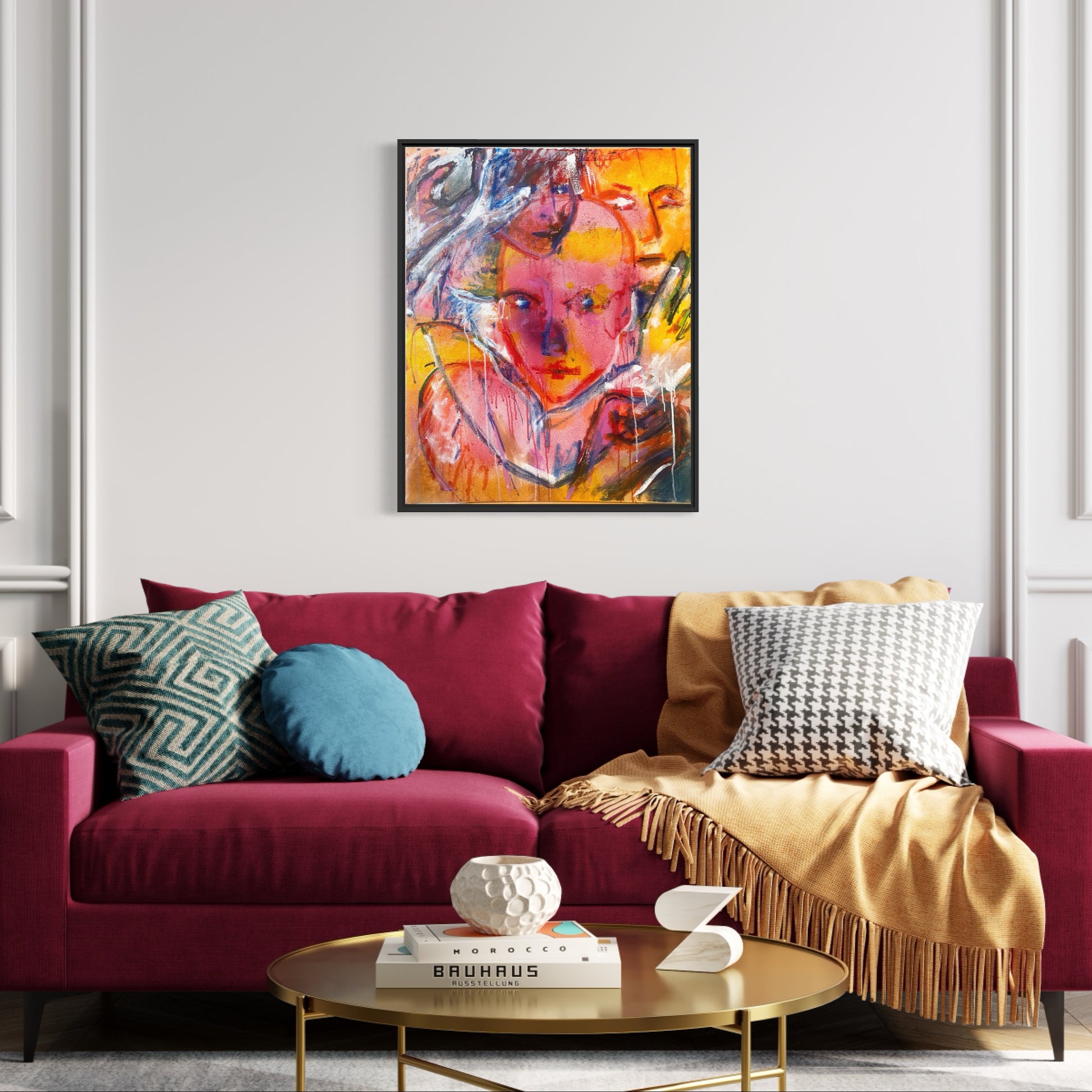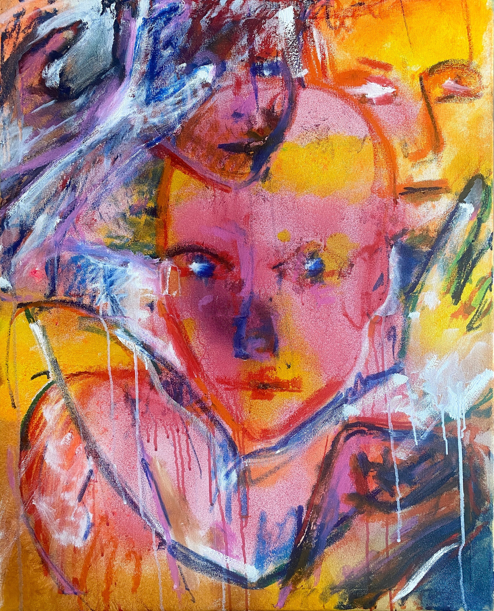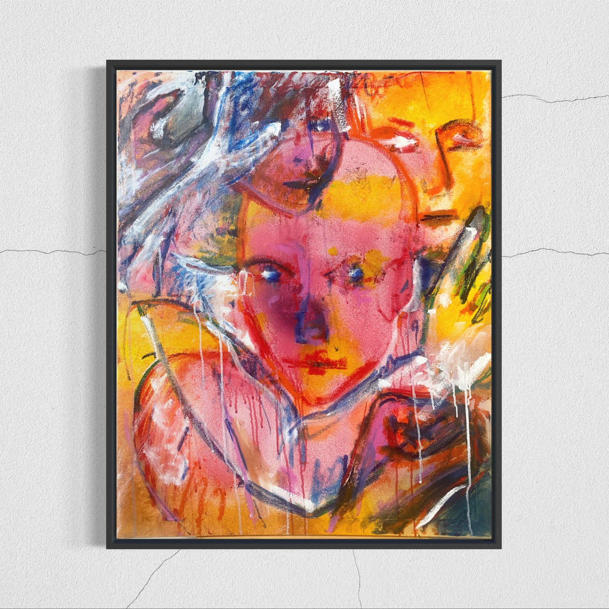 This expressive painting evokes fragments of memory and the artist’s inner world. A central figure with piercing blue eyes emerges from a swirl of vivid reds, yellows, and cool blues—like a memory surfacing through time. Blurred faces and reaching hands dissolve into the background, hinting at fleeting connections and forgotten moments.