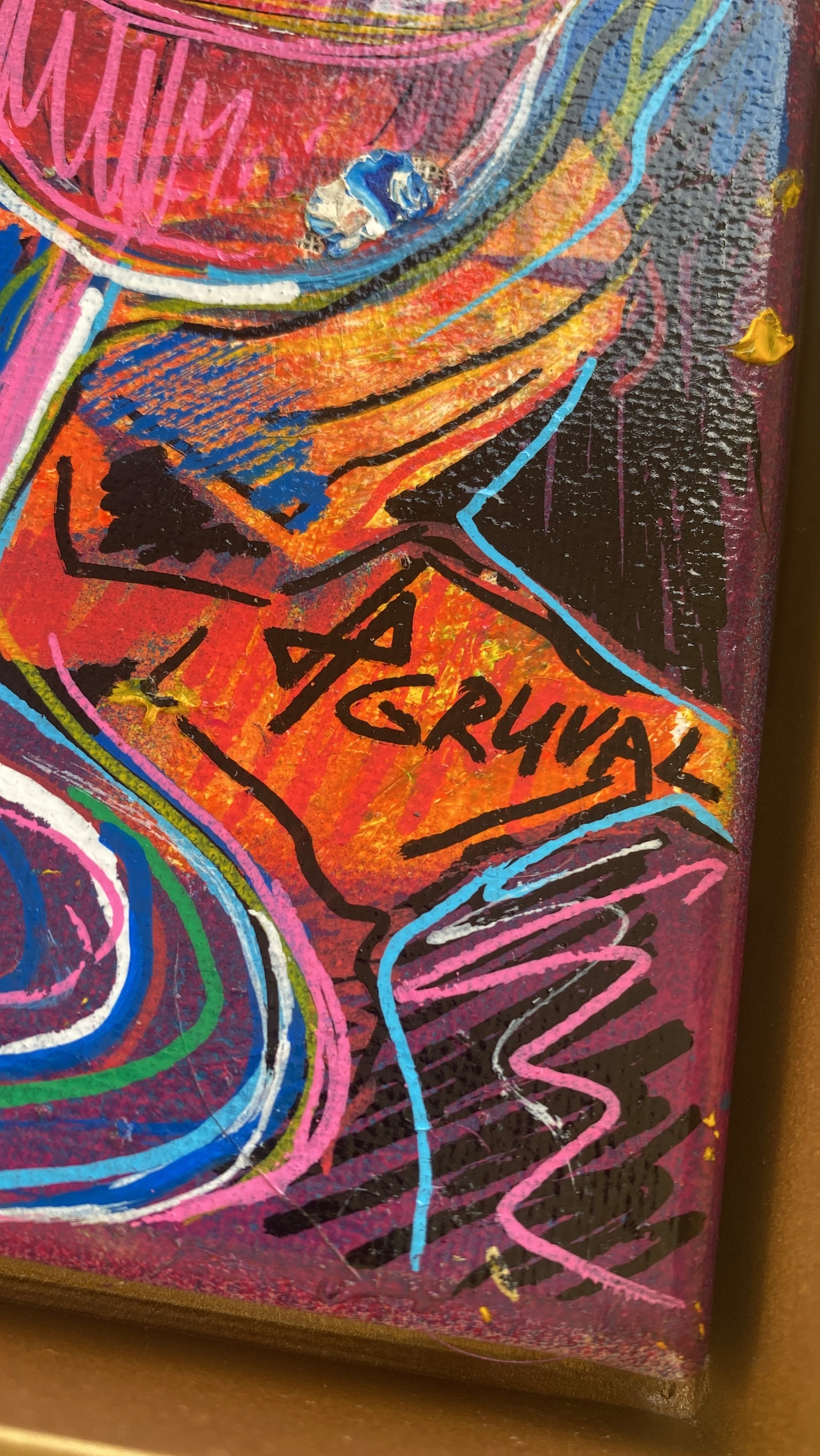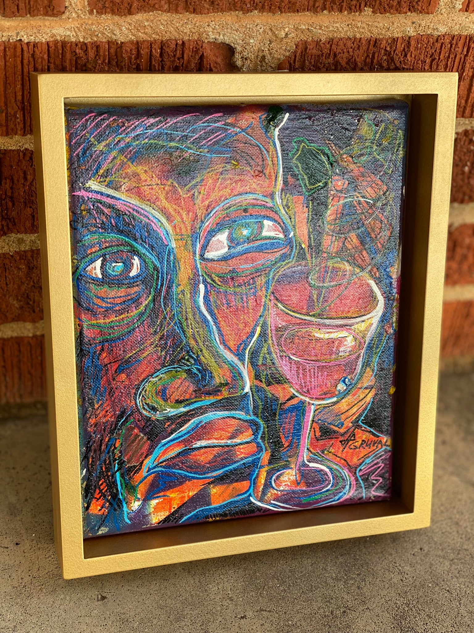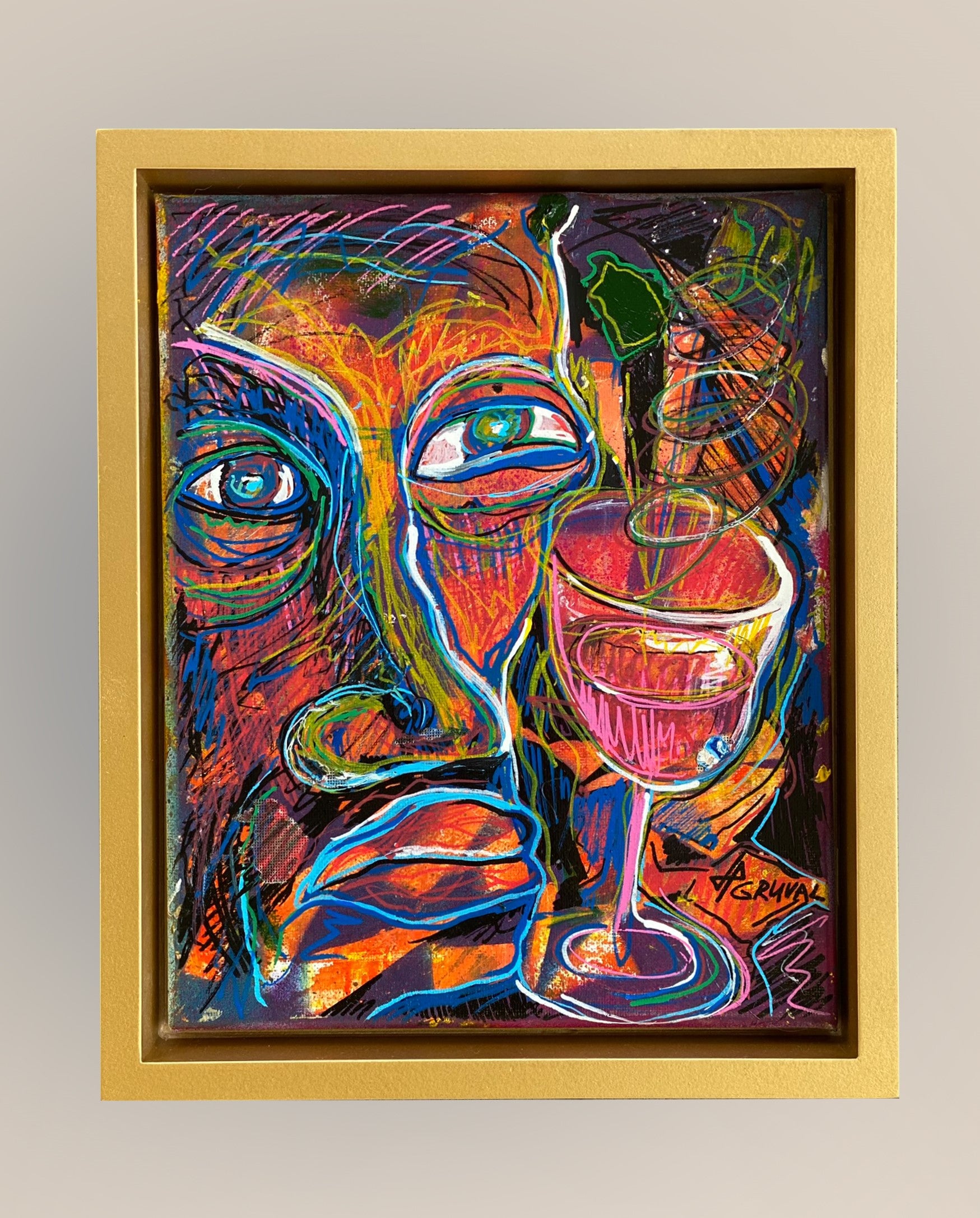 “Lonely Party Man” powerfully conveys the paradox of solitude in a crowded celebration. The vibrant palette and swirling forms capture the chaotic energy of a party, contrasting with the figure’s introspective expression.