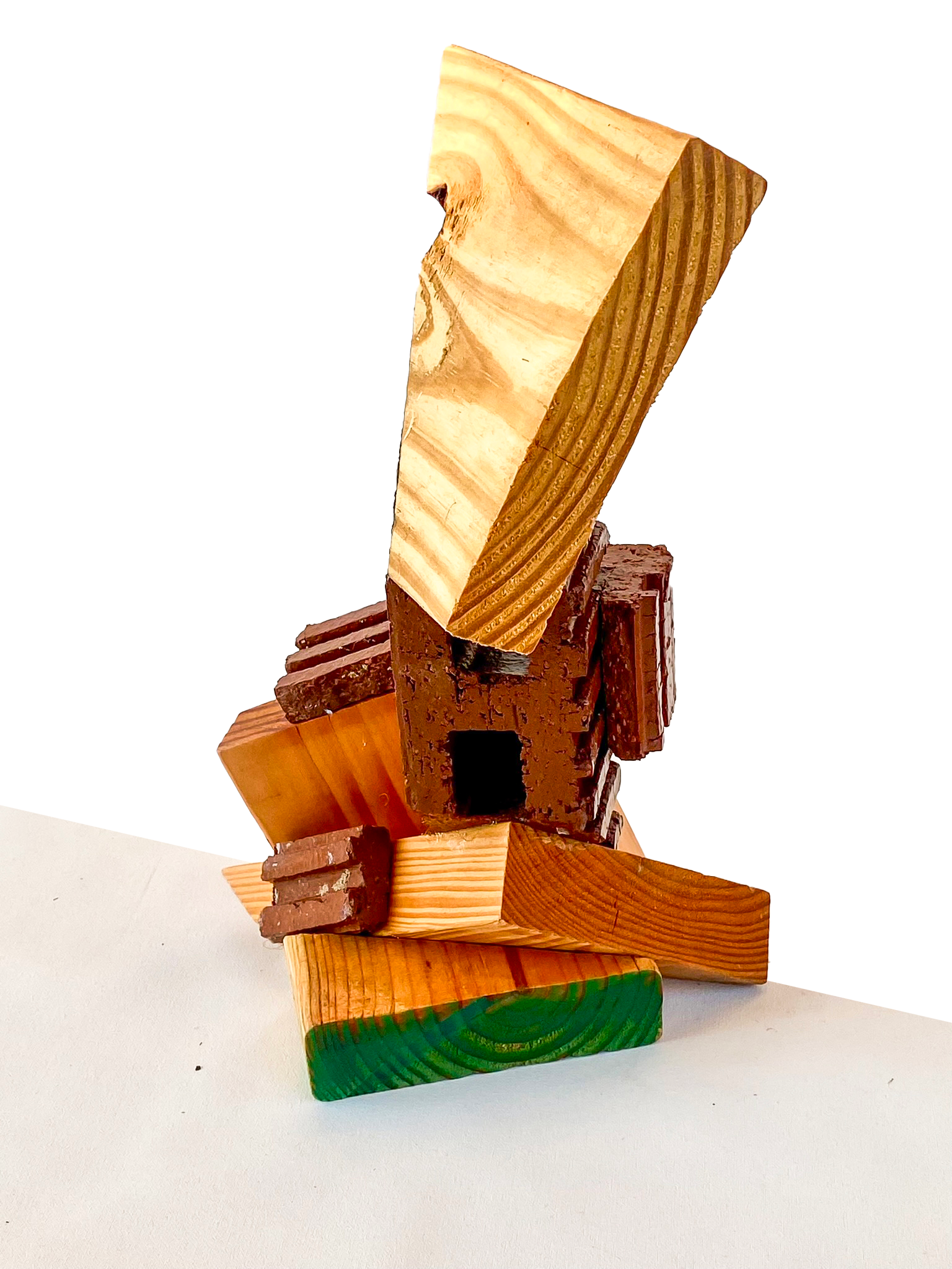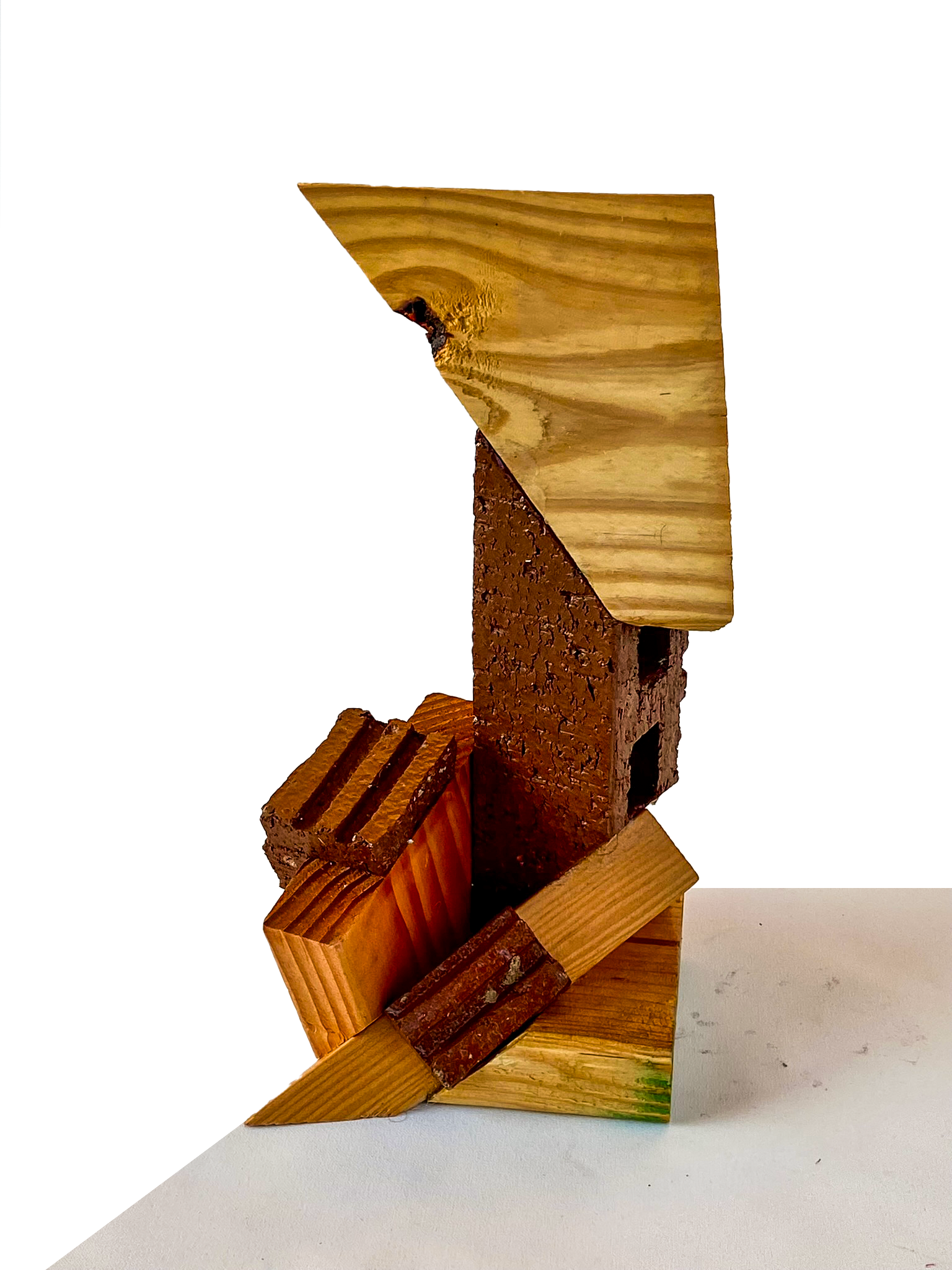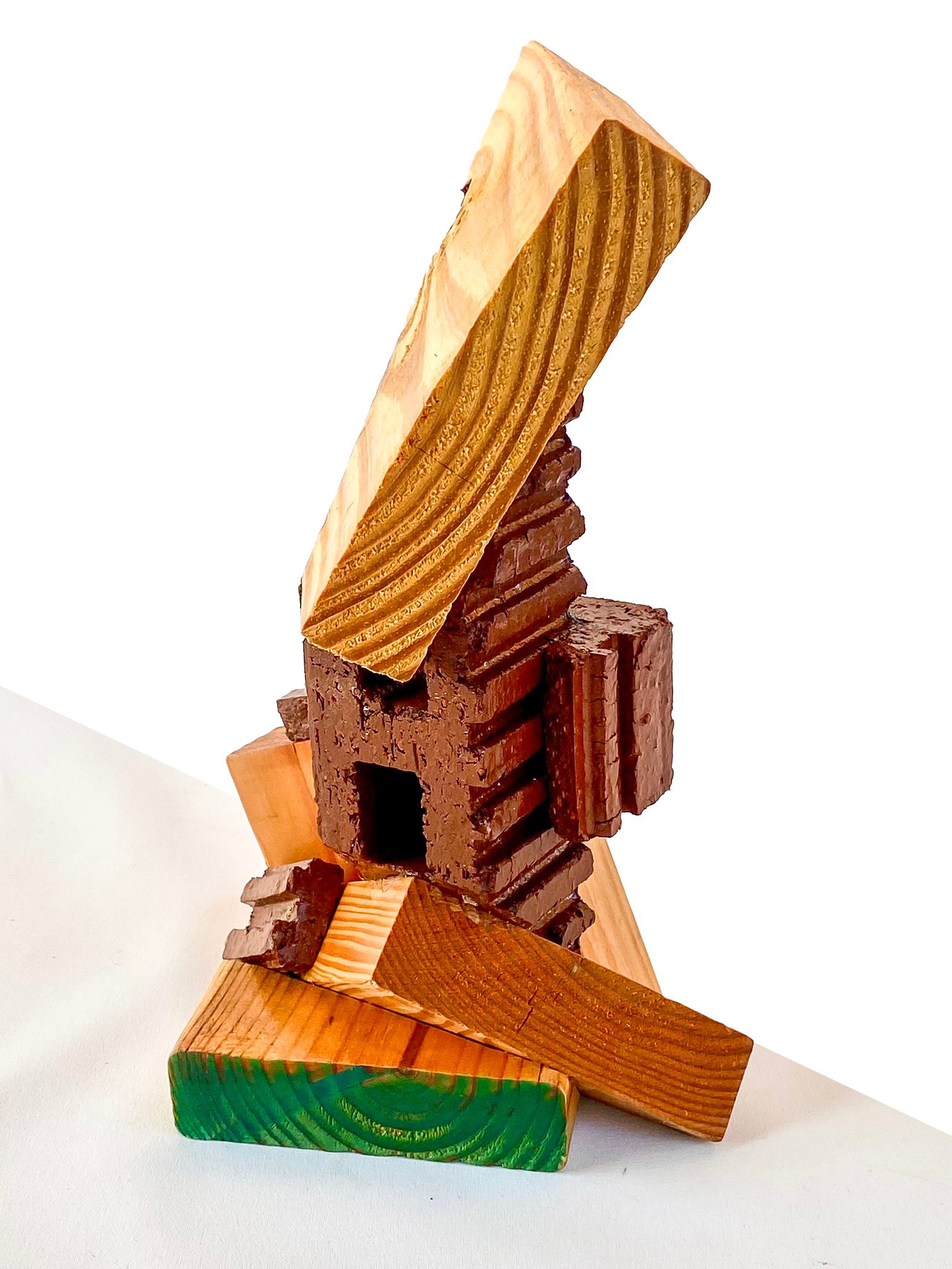 This sculpture is a fascinating exploration of architectural balance and composition, created from wood and bricks salvaged from a construction site. The interplay of the angular wooden forms and the rugged, tactile bricks creates a dynamic tension, highlighting the artist’s ability to harmonize disparate materials.
