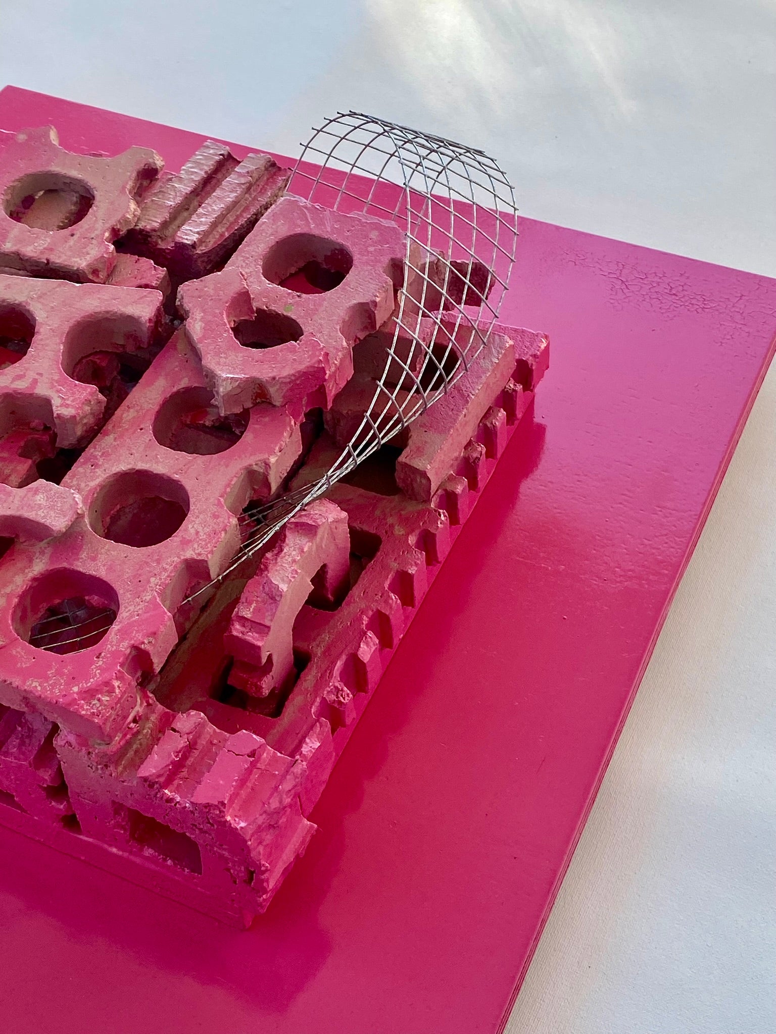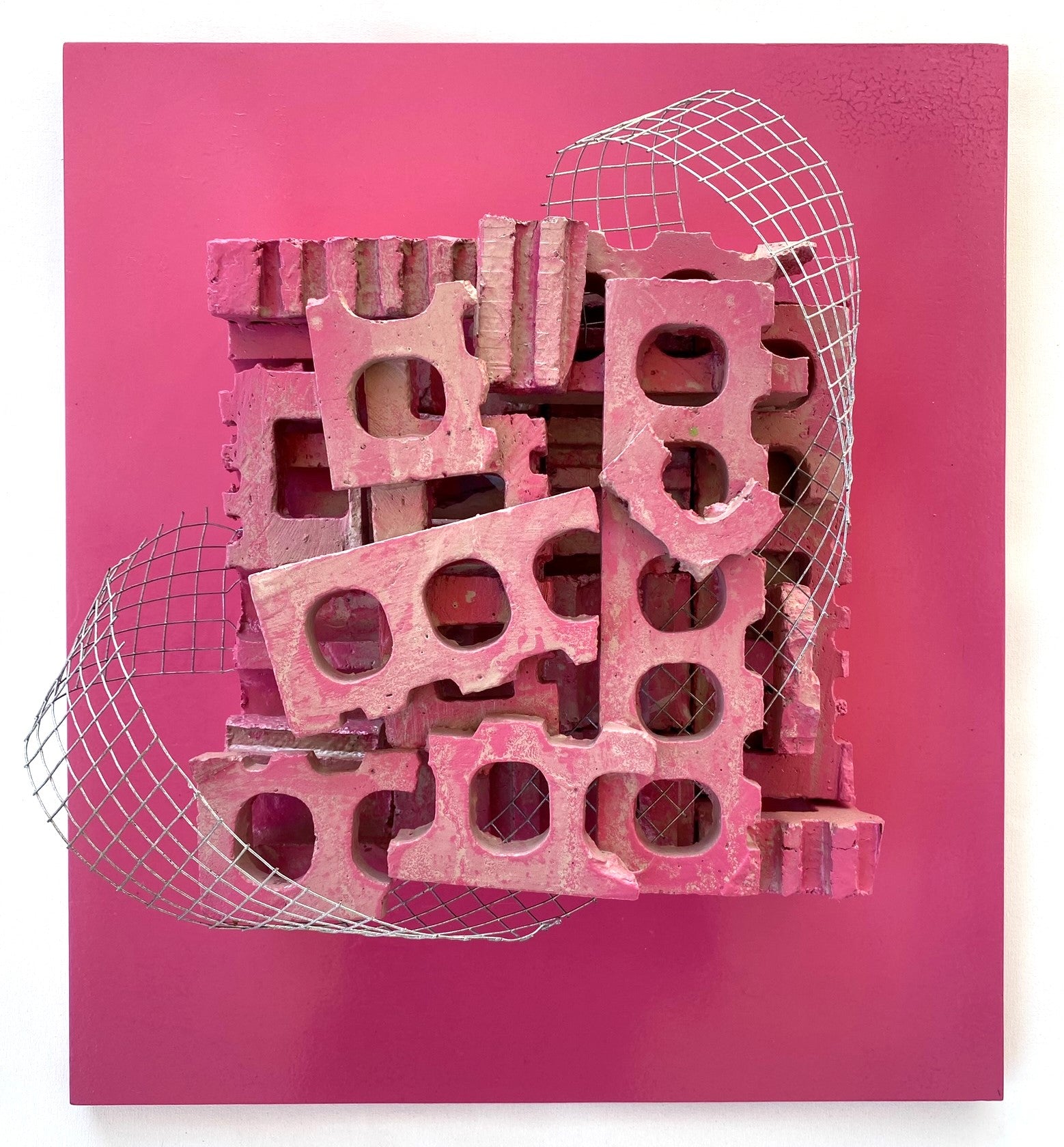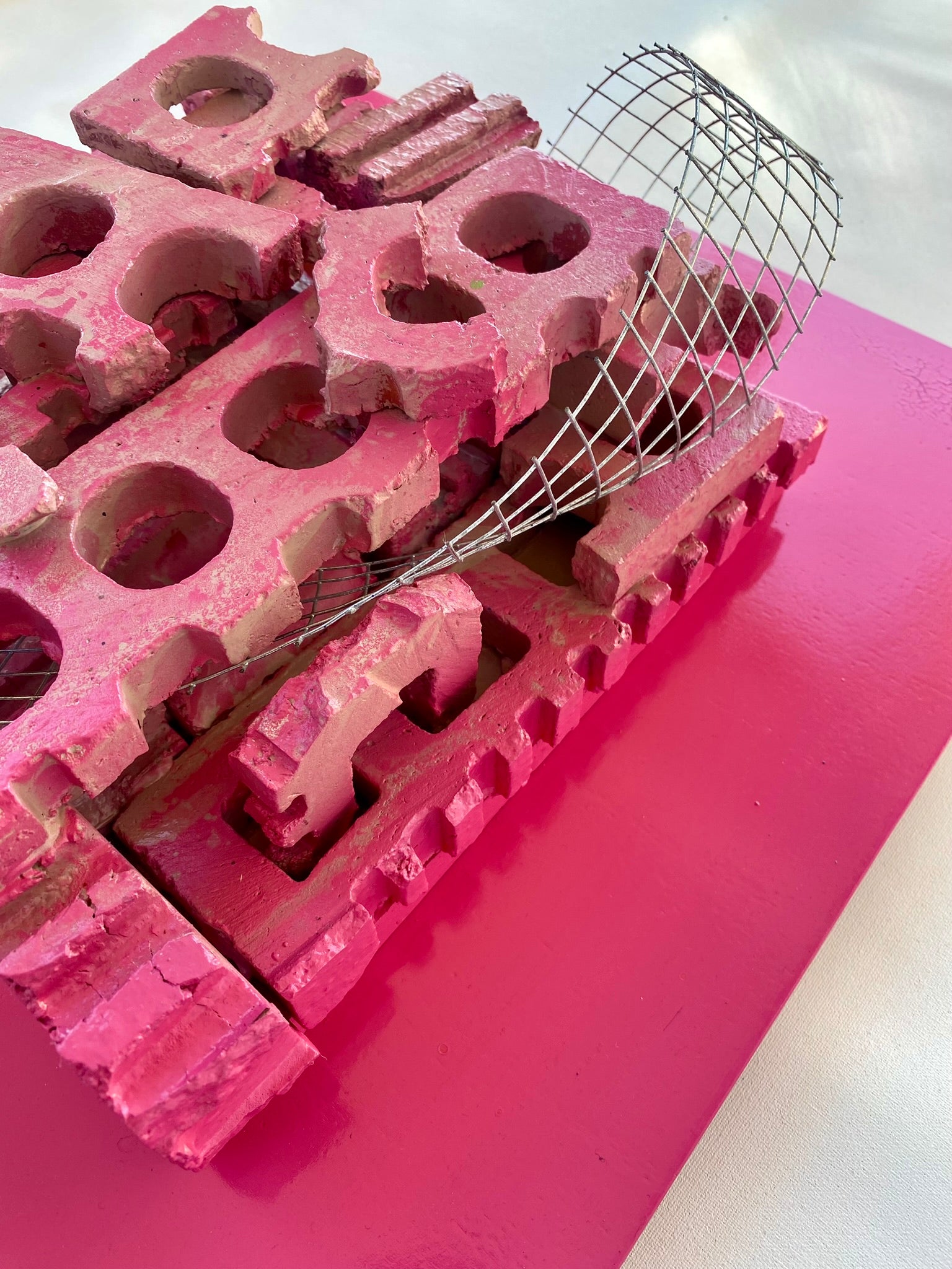 20”x 20” plywood panel brought to life with a mosaic of hand-cut bricks and wire, painted in soothing pink and beige tones.