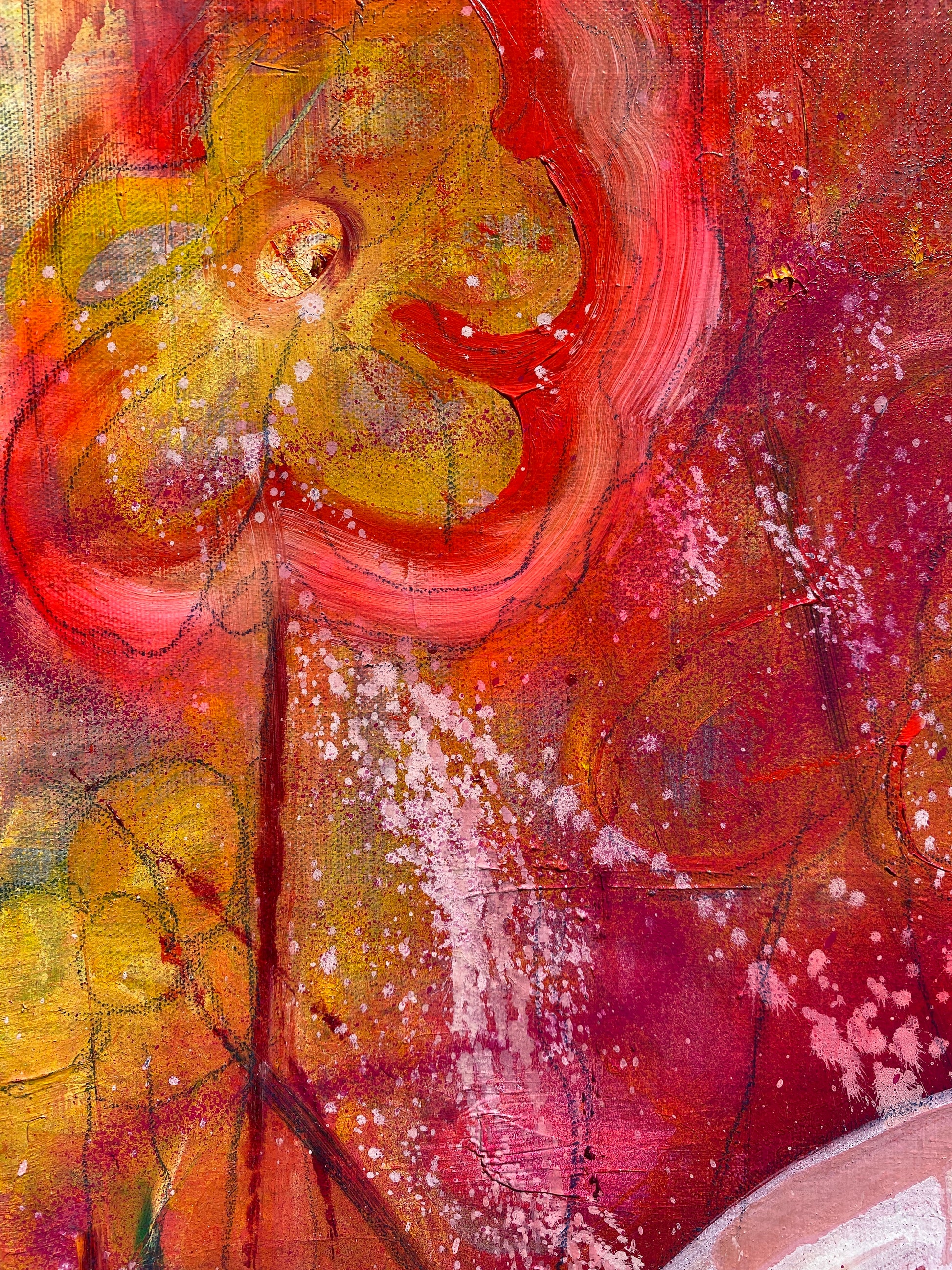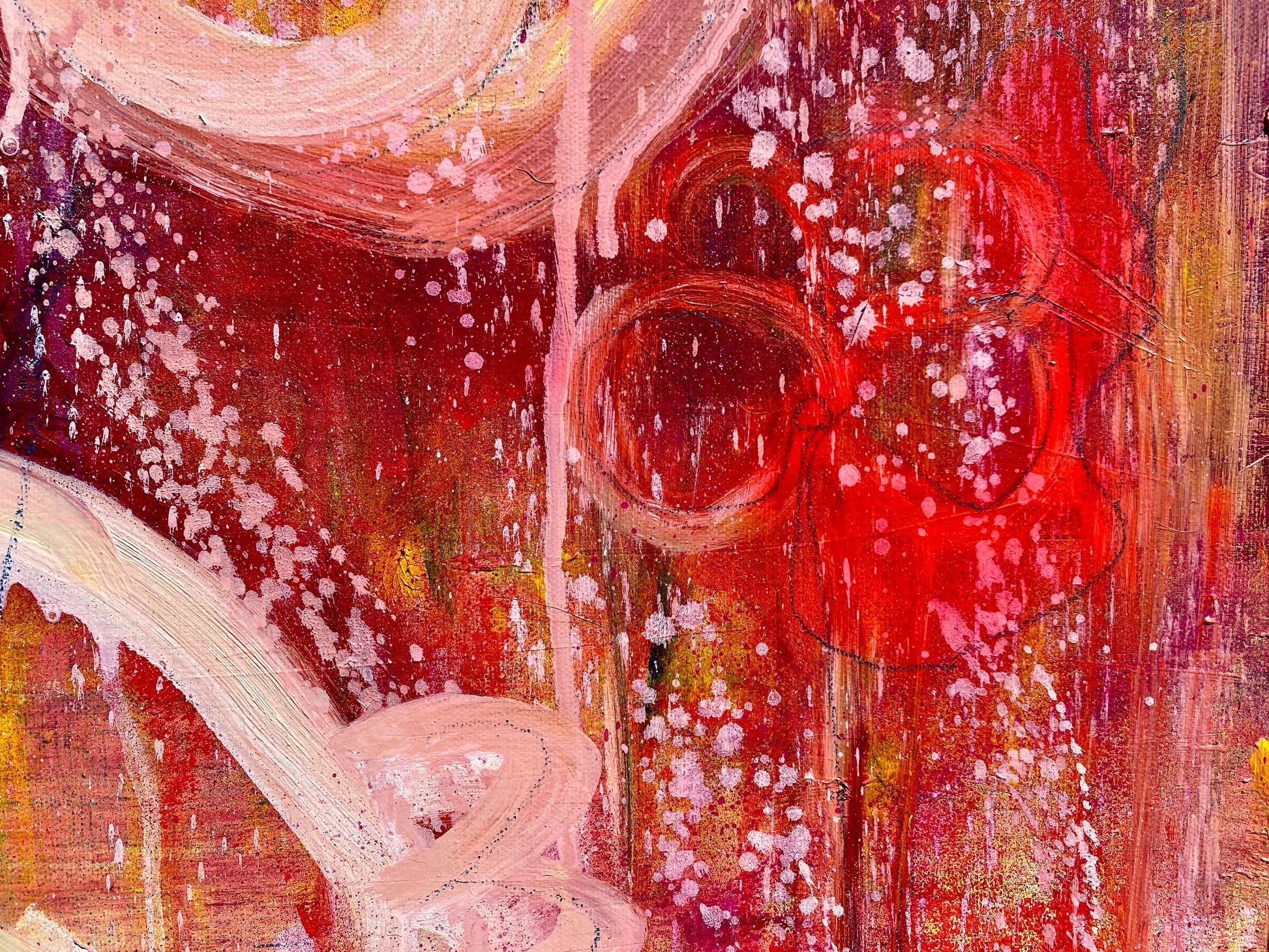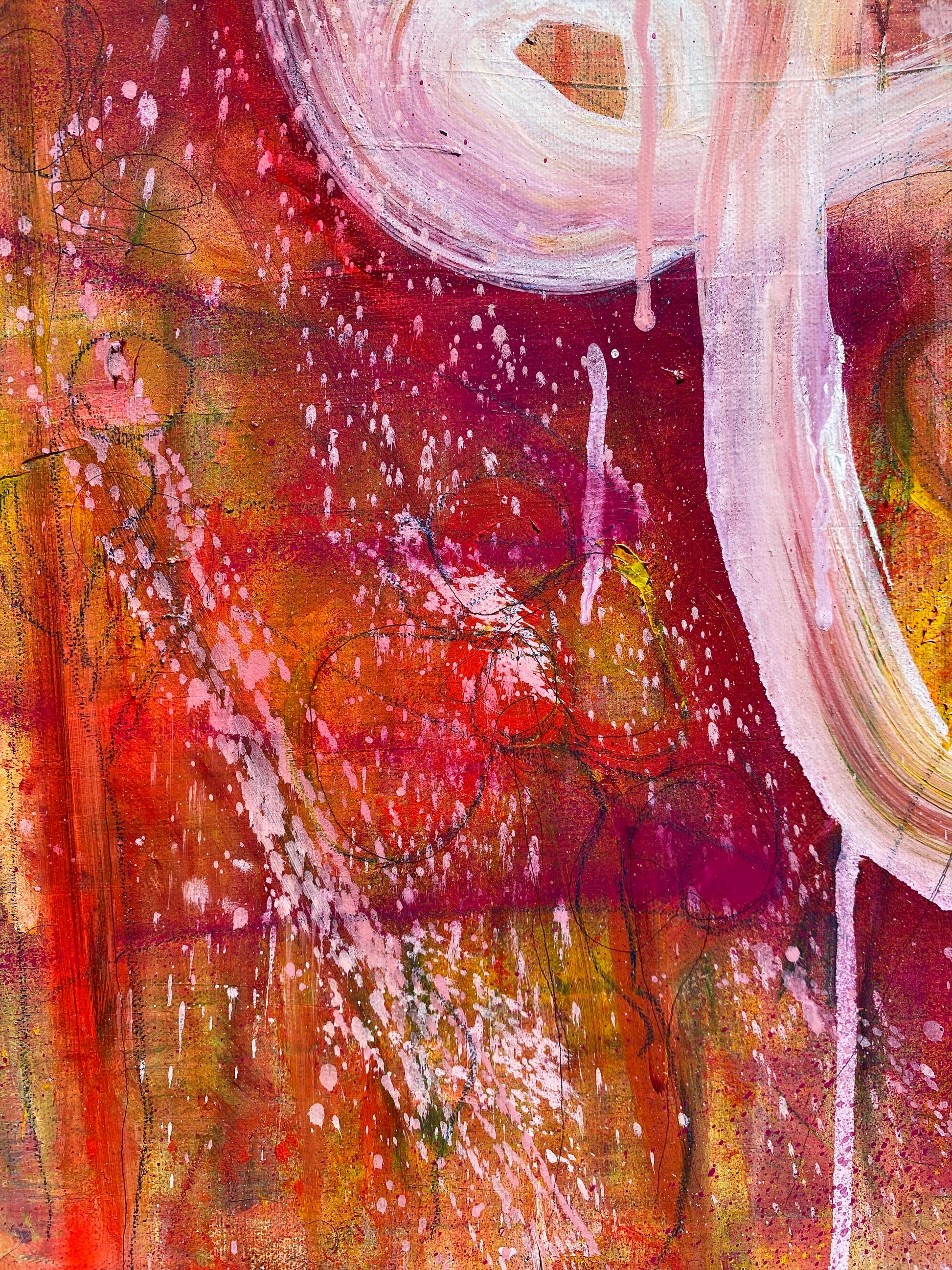 Radiant and evocative exploration of form, texture, and emotional resonance. The abstracted figure at the center, outlined in soft, flowing strokes of pale pink and white, contrasts beautifully against the fiery backdrop of warm reds, oranges, and yellows. The drips and splatters of paint lend an ethereal, almost transient quality, as though the figure is emerging or dissolving within the energetic atmosphere.