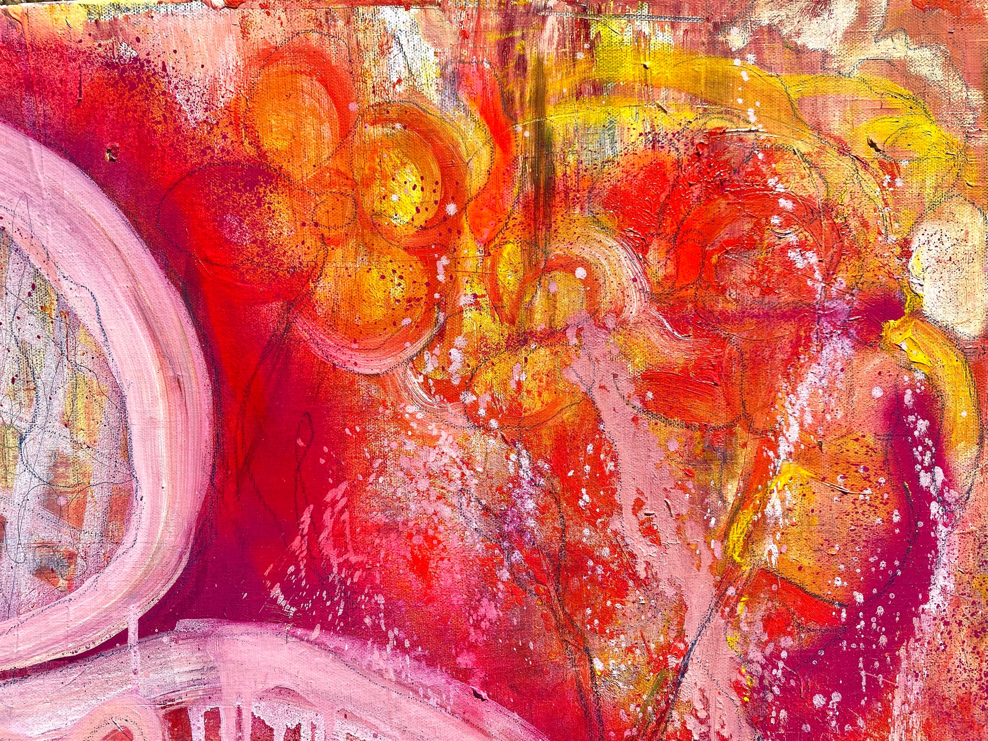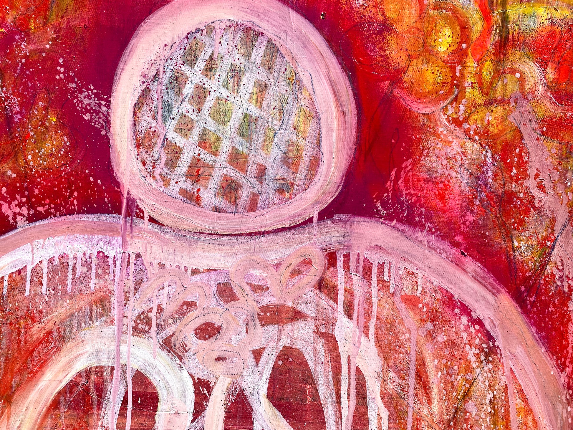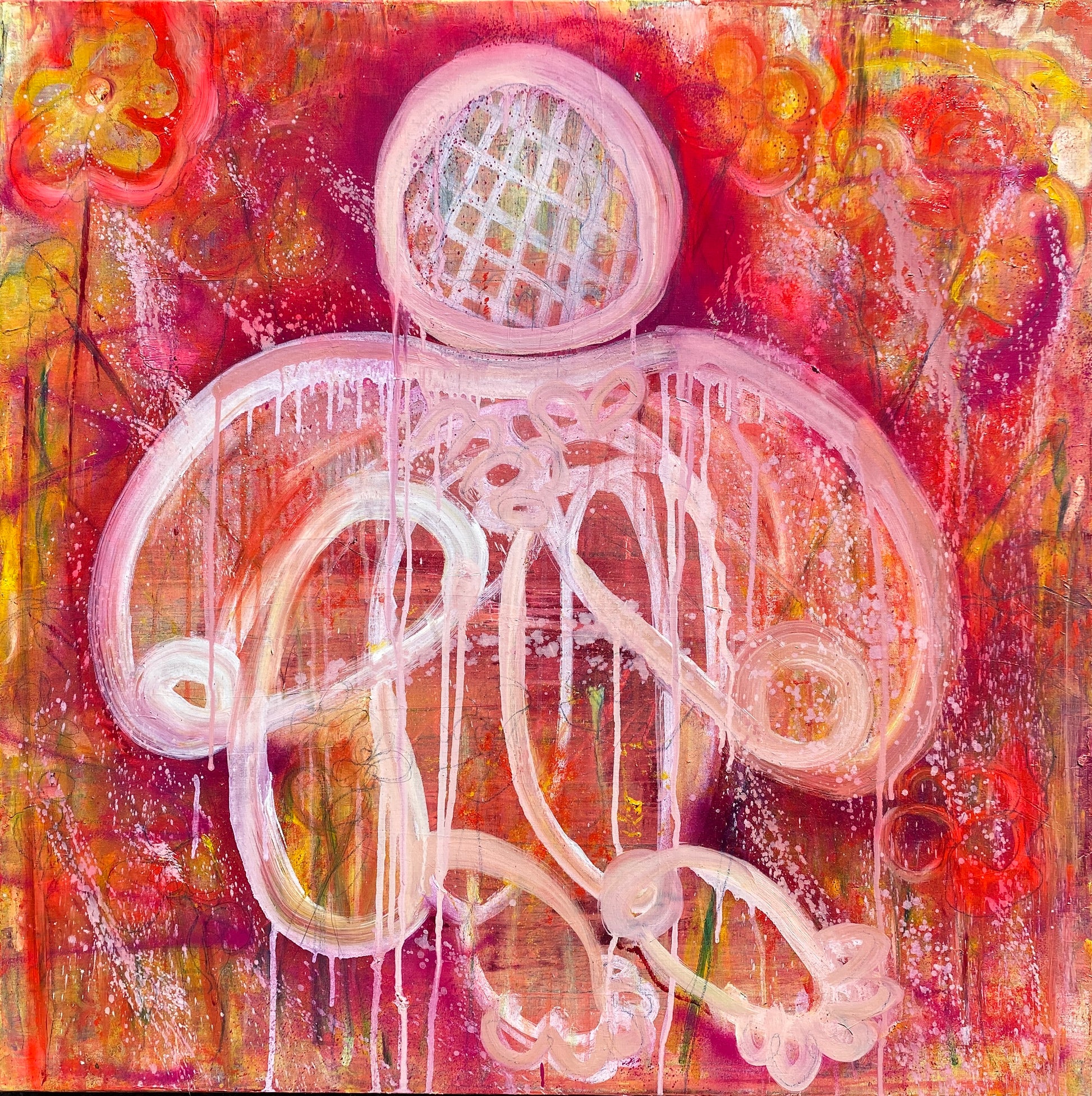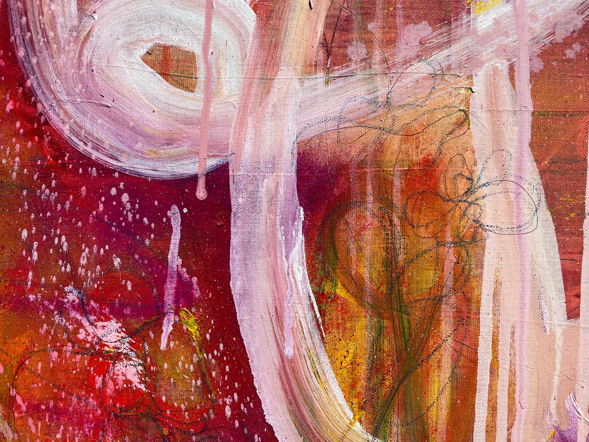 Radiant and evocative exploration of form, texture, and emotional resonance. The abstracted figure at the center, outlined in soft, flowing strokes of pale pink and white, contrasts beautifully against the fiery backdrop of warm reds, oranges, and yellows. The drips and splatters of paint lend an ethereal, almost transient quality, as though the figure is emerging or dissolving within the energetic atmosphere.